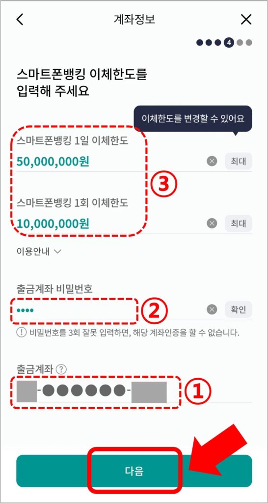 ③ 본인의 [하나은행 출금계좌] → [계좌 비밀번호] → [변경할 이체한도액]을 입력한 뒤 [다음]을 선택합니다.