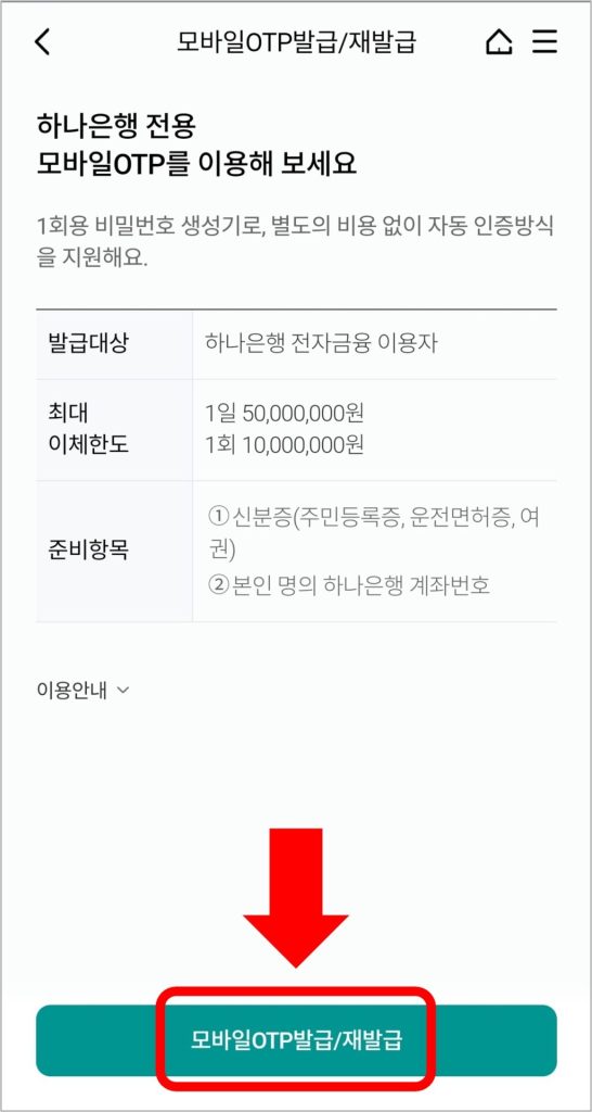 하나은행 모바일 앱과 신분증이 있으면 모바일 OTP를 발급받을 수 있습니다.
