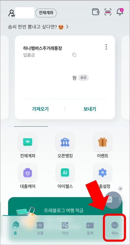 ① 하나은행 모바일 앱을 실행하고 로그인합니다.