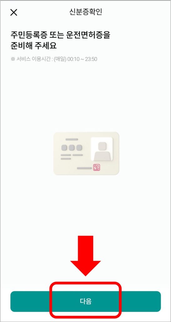 ⑤ 이체한도 변경을 위해서는 신분증 확인이 필요합니다. 주민등록증이나 운전면허증을 촬영해서 신분증 확인을 하면 이체한도 변경이 완료됩니다.