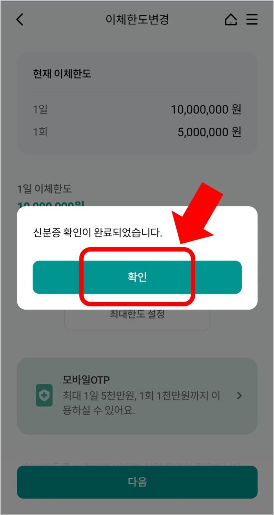 ⑤ 이체한도 변경을 위해서는 신분증 확인이 필요합니다. 주민등록증이나 운전면허증을 촬영해서 신분증 확인을 하면 이체한도 변경이 완료됩니다.