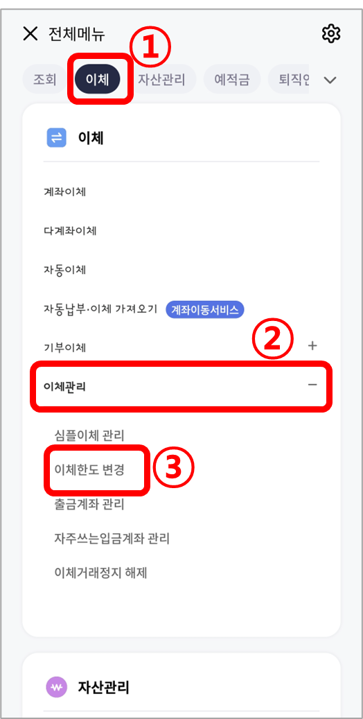 ③ 전체메뉴에서 [이체] → [이체관리] → [이체한도 변경] 순으로 선택합니다.