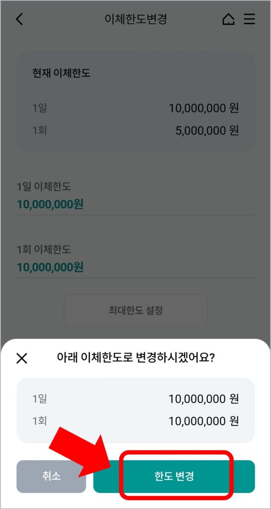 본인의 최대한도 내에서 이체한도를 변경하는 것은 간단합니다. 원하는 이체한도를 입력 후 [다음] → [한도변경]을 선택하시면 됩니다.