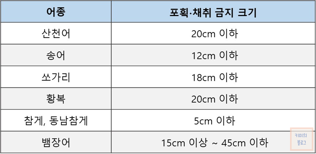산천어, 송어, 쏘가리, 황복, 참게, 뱀장어 등은 너무 작은 크기의 물고기는 잡을 수 없습니다.