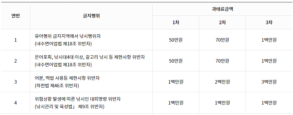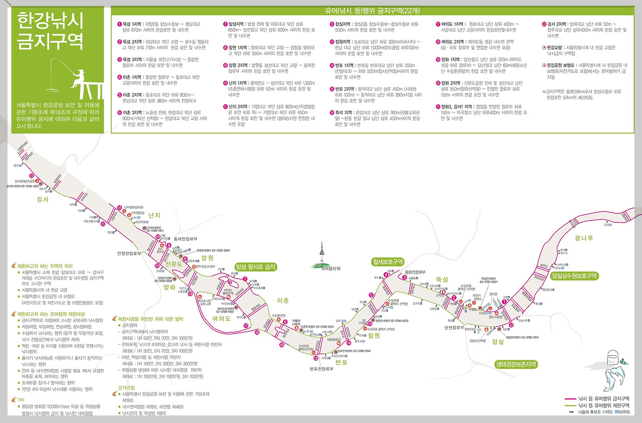 한강에는 낚시가 금지된 구역도 있습니다. 금지구역에서 낚시를 하거나 어분, 떡밥 사용, 은어포획과 같이 제한사항을 위반할 경우 과태료가 부과됩니다.