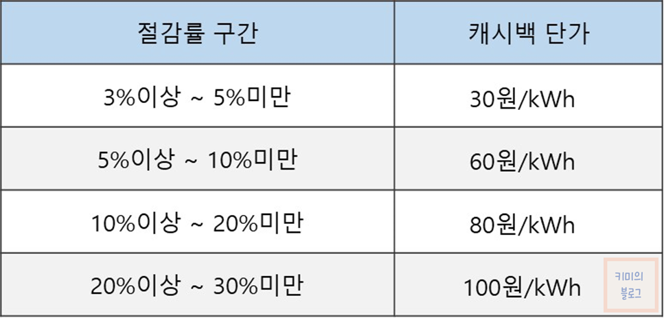 캐시백 지급 기준은 직전 2개년 동월 평균에 비해서 3% 이상 절감할 경우 환급받을 수 있습니다. 절감률 30% 한도 내에서 구간별로 1 kWh당 30~100원을 지급합니다.
