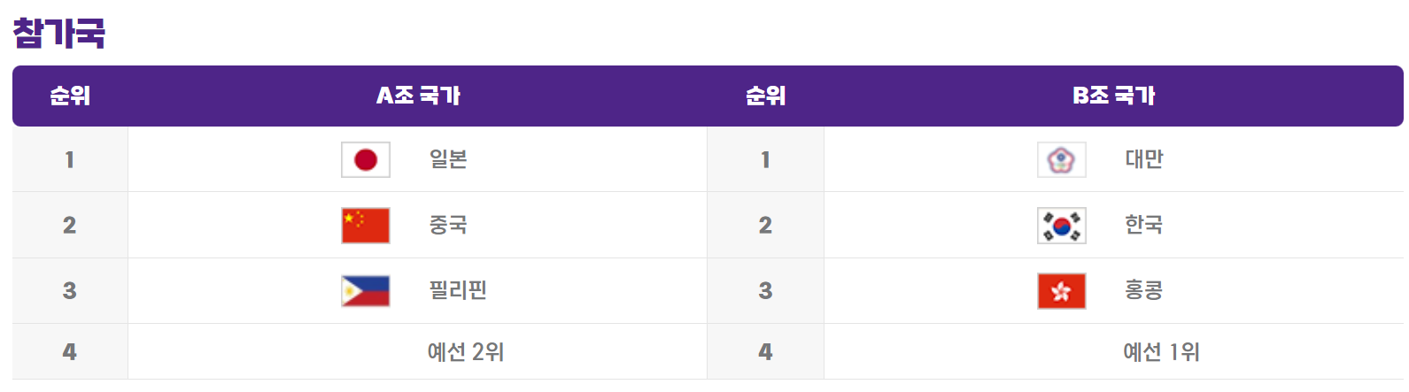 대한민국은 아시아 지역 세계랭킹 4위로, 예선 없이 곧장 본선라운드부터 시작합니다. B조에 속하여 홍콩, 대만, 그리고 예선을 통화한 국가와 각각 조별 리그를 치릅니다.