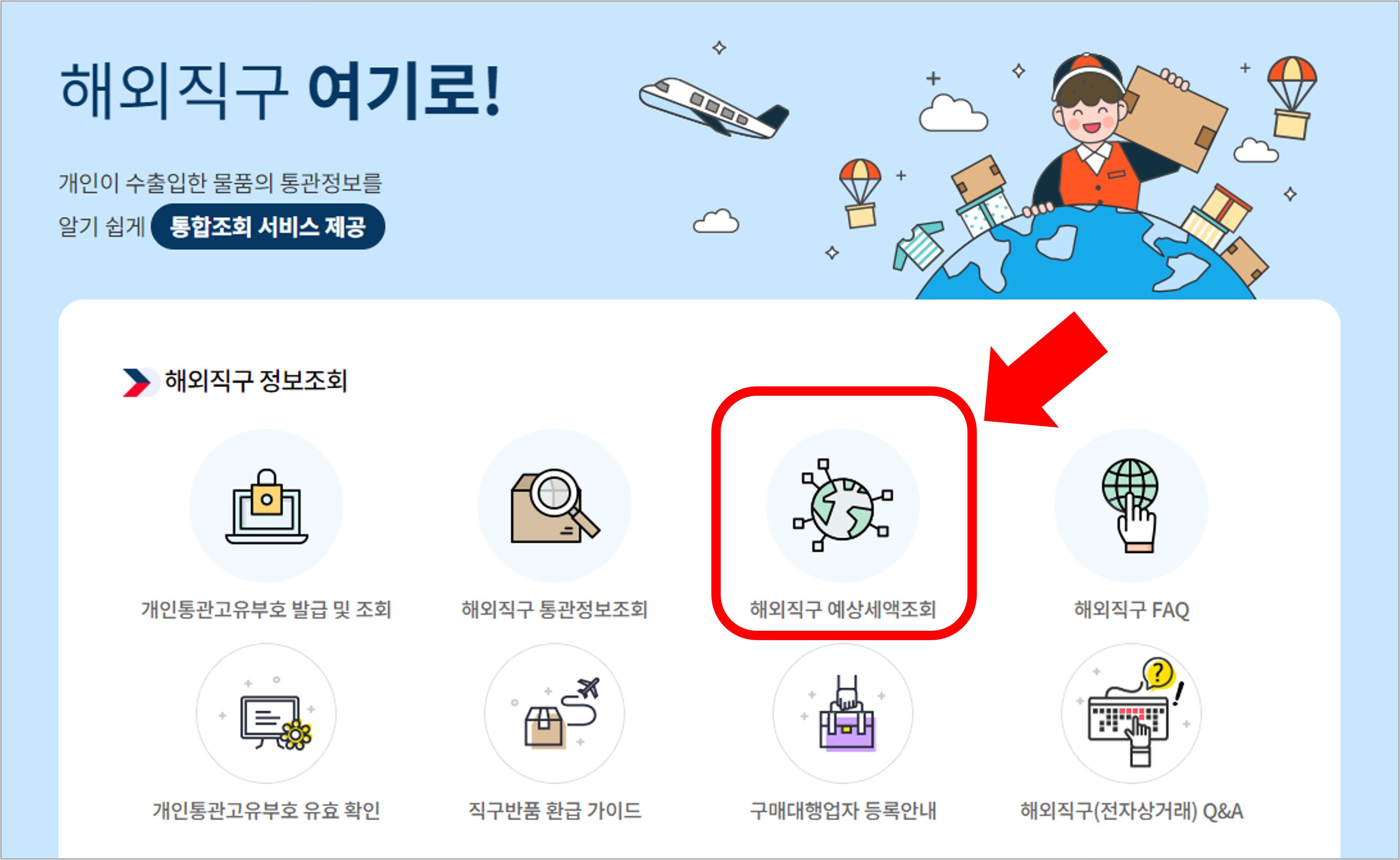관세청 사이트에서 '해외직구 예상세액조회'서비스를 선택합니다.