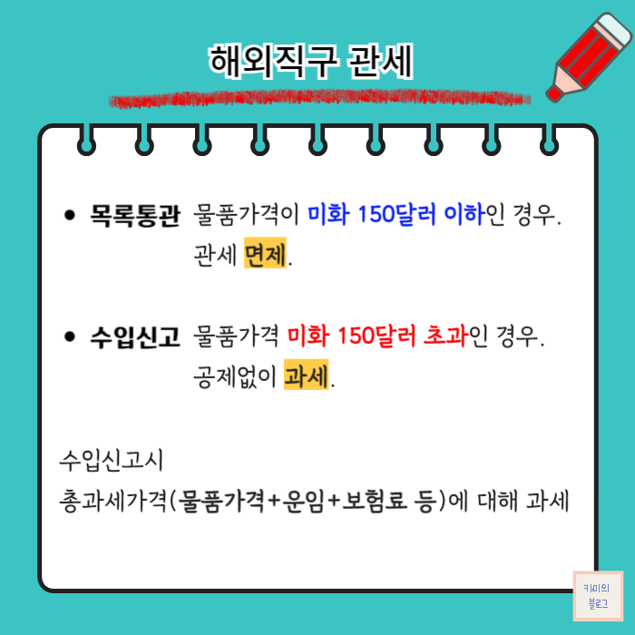 즉, 구입하는 물품의 가격이 150달러 이하면 대부분 세금을 면제받을 수 있기 때문에 18~19만 원 이하의 물품 구입 시에는 관세를 신경 쓰지 않으셔도 됩니다.
