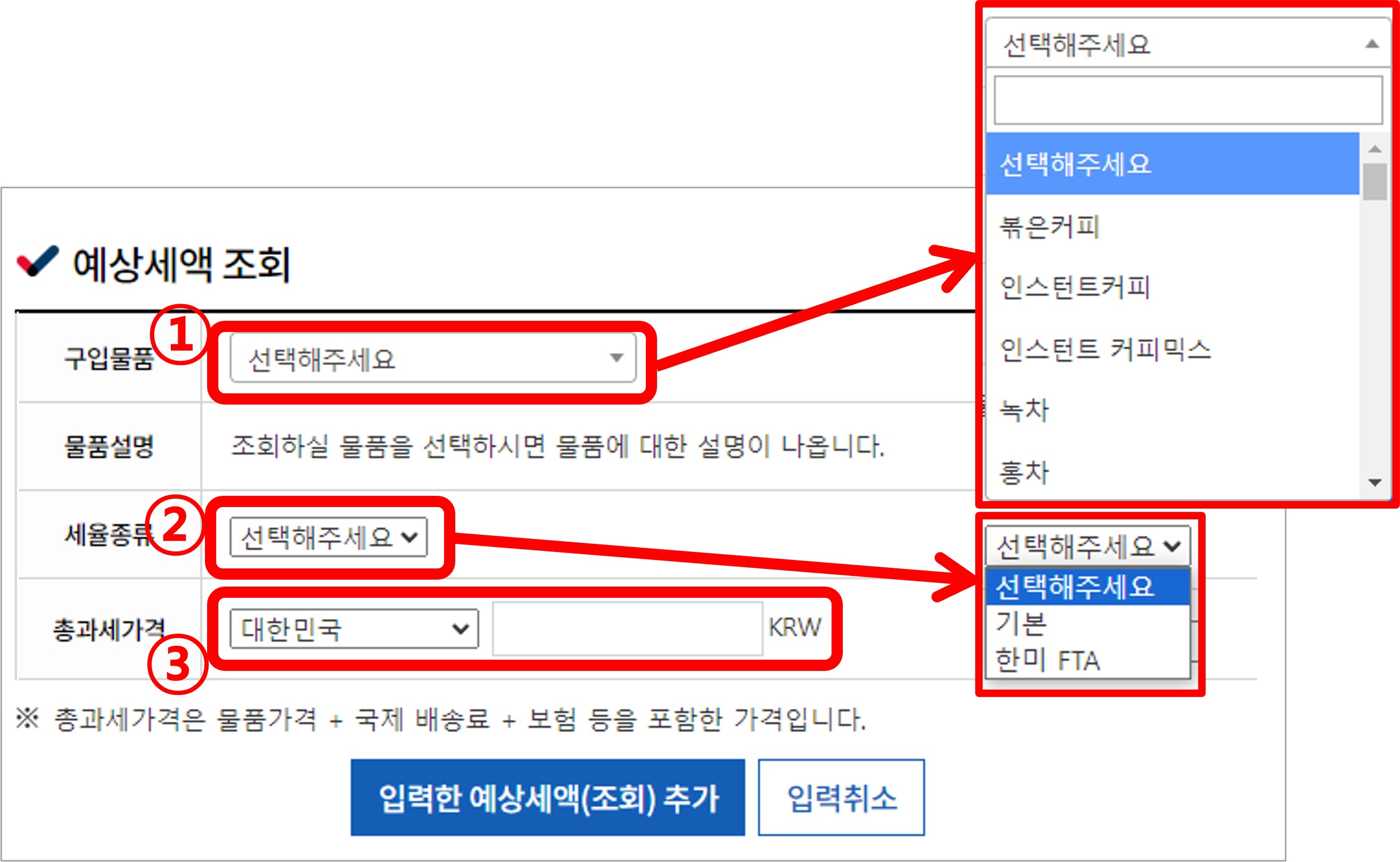 ③ 총 과세가격은 구입하는 물품의 가격을 해당국가의 통화 또는 한화로 입력하시면 됩니다.