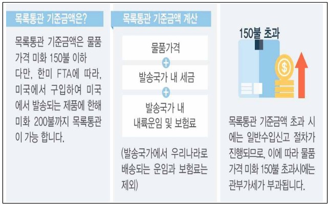 목록통관은 개인이 자가사용으로 구입하고, 물품가격이 150달러 이하인 경우에는 배송업체가 통관목록을 제출하는 것으로 신고가 대체되고 관세가 부과되지 않습니다.