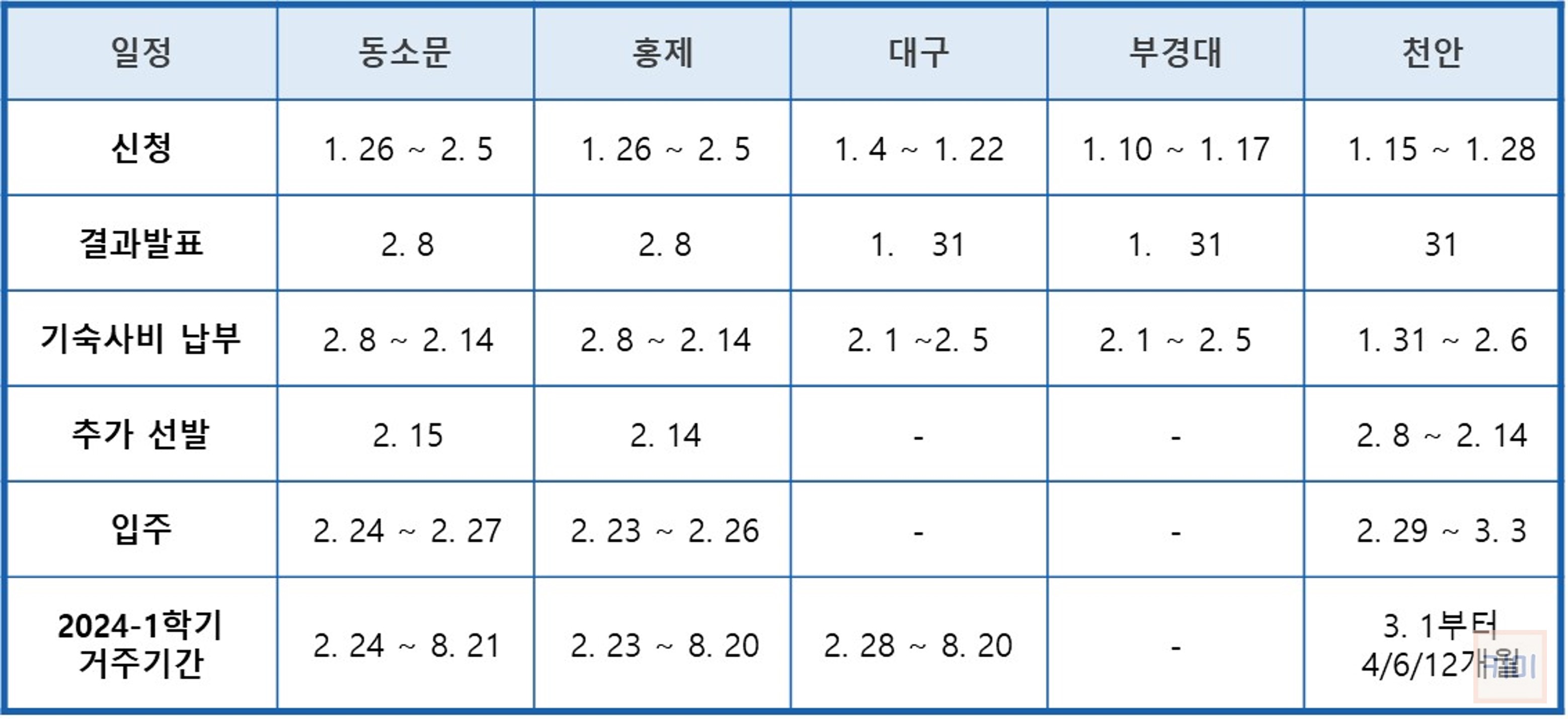 행복기숙사 입사 신청은 지역마다 다른 일정으로 진행됩니다. 2024년 1학기 입사 신청 기간은 다음과 같습니다.