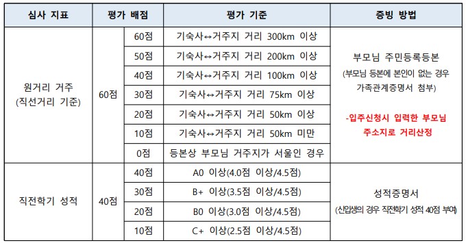 그러고 나서 공실이 있는 경우 거주지와의 거리와 직전학기 성적을 고려하여 일반입주생을 선발합니다.