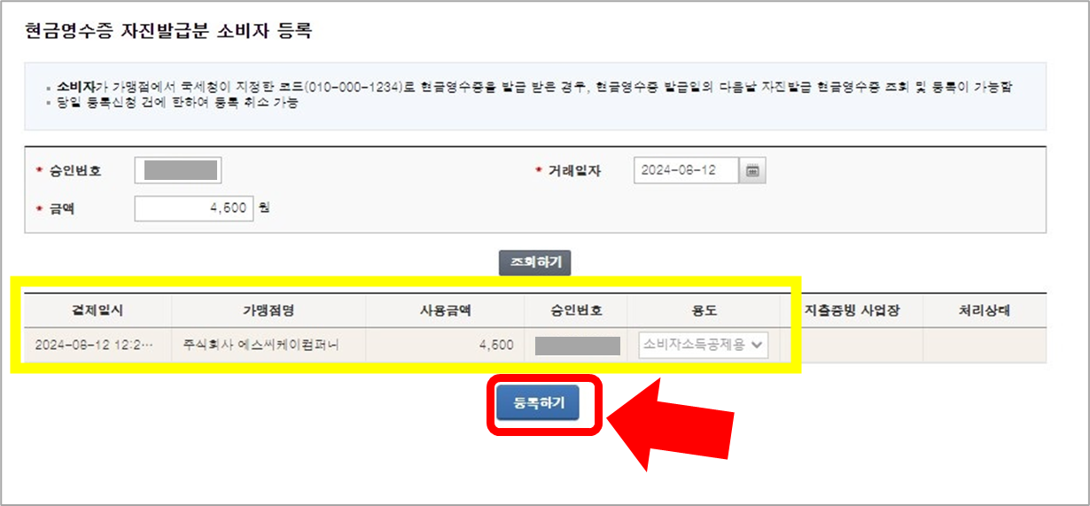 그러면 아래에 결제내역이 조회됩니다. [등록하기]를 클릭하면 현금영수증 자진발급분 신청이 완료됩니다.