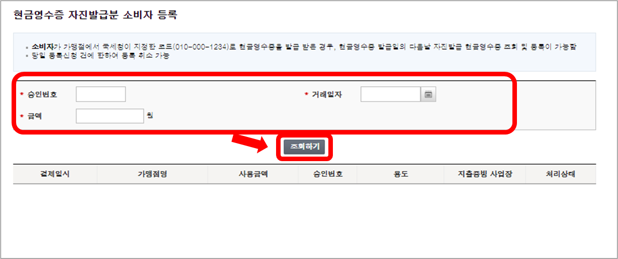 영수증에 적혀있는 승인번호, 거래일자, 금액을 입력하고 [조회하기]를 클릭합니다.