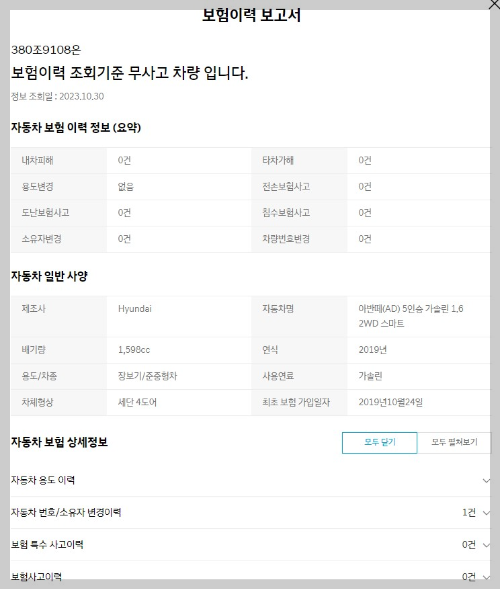 그리고 차량의 이력을 자세히 확인할 수 있습니다. 현대차에서는 차량 점검 리포트와 보험 사고이력을 모두 공개해, 해당 차량에 대한 모든 내역을 구매자가 확인할 수 있도록 했습니다.
