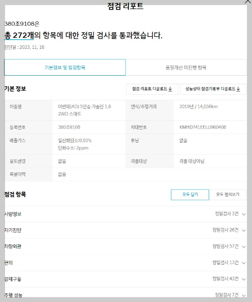 그리고 차량의 이력을 자세히 확인할 수 있습니다. 현대차에서는 차량 점검 리포트와 보험 사고이력을 모두 공개해, 해당 차량에 대한 모든 내역을 구매자가 확인할 수 있도록 했습니다.