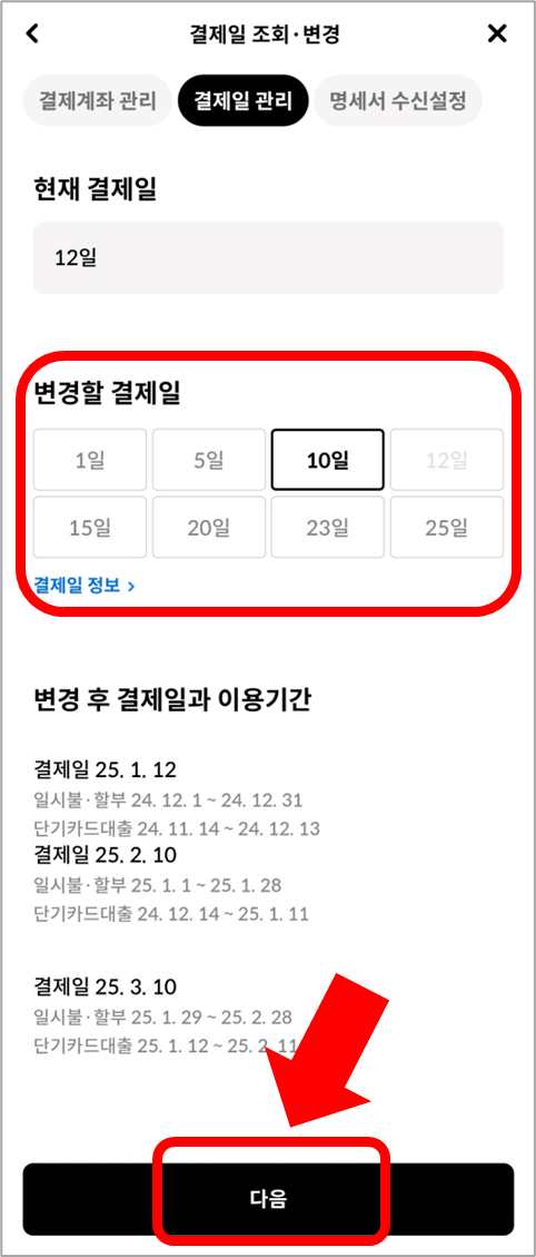 결제일을 선택하고 [다음]으로 넘어갑니다.
