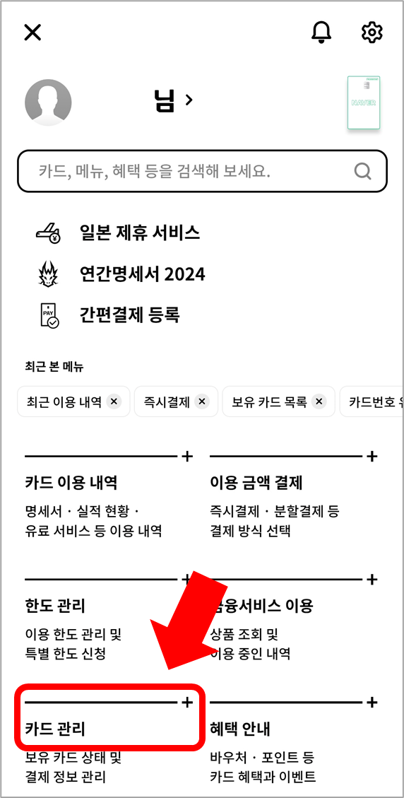 앱에 로그인 한 뒤 [전체메뉴]로 가서 [카드 관리] → [결제 정보 조회·변경]을 선택합니다.