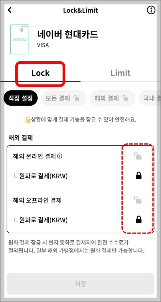 Lock 탭에서 해외결제 차단에 대해 설정 가능합니다. Limit 탭에서는 결제 한도를 설정할 수 있습니다.