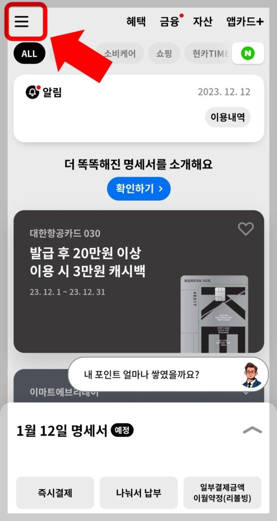 먼저 현대카드 앱을 설치하고 로그인합니다.