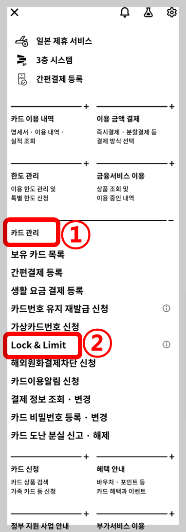 카드관리 항목에 있는 Lock & Limit을 선택합니다.