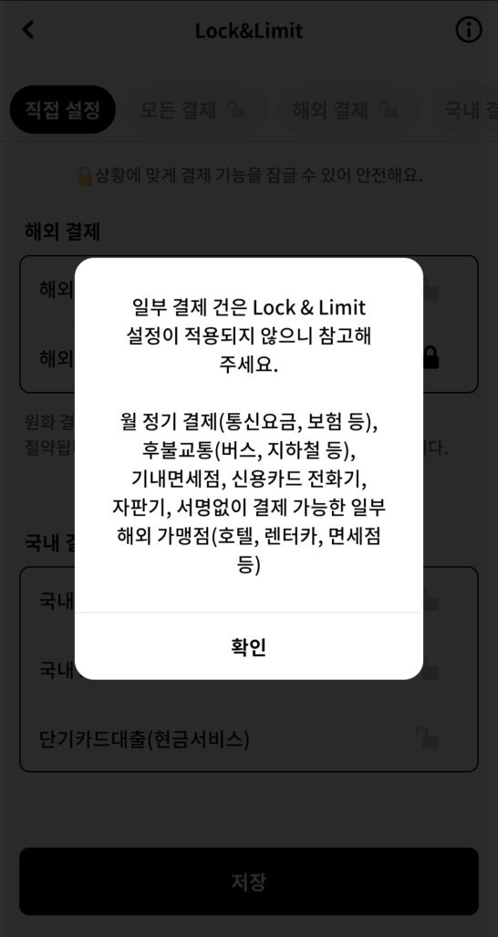 Lock 탭에서 해외결제 차단에 대해 설정 가능합니다. Limit 탭에서는 결제 한도를 설정할 수 있습니다.