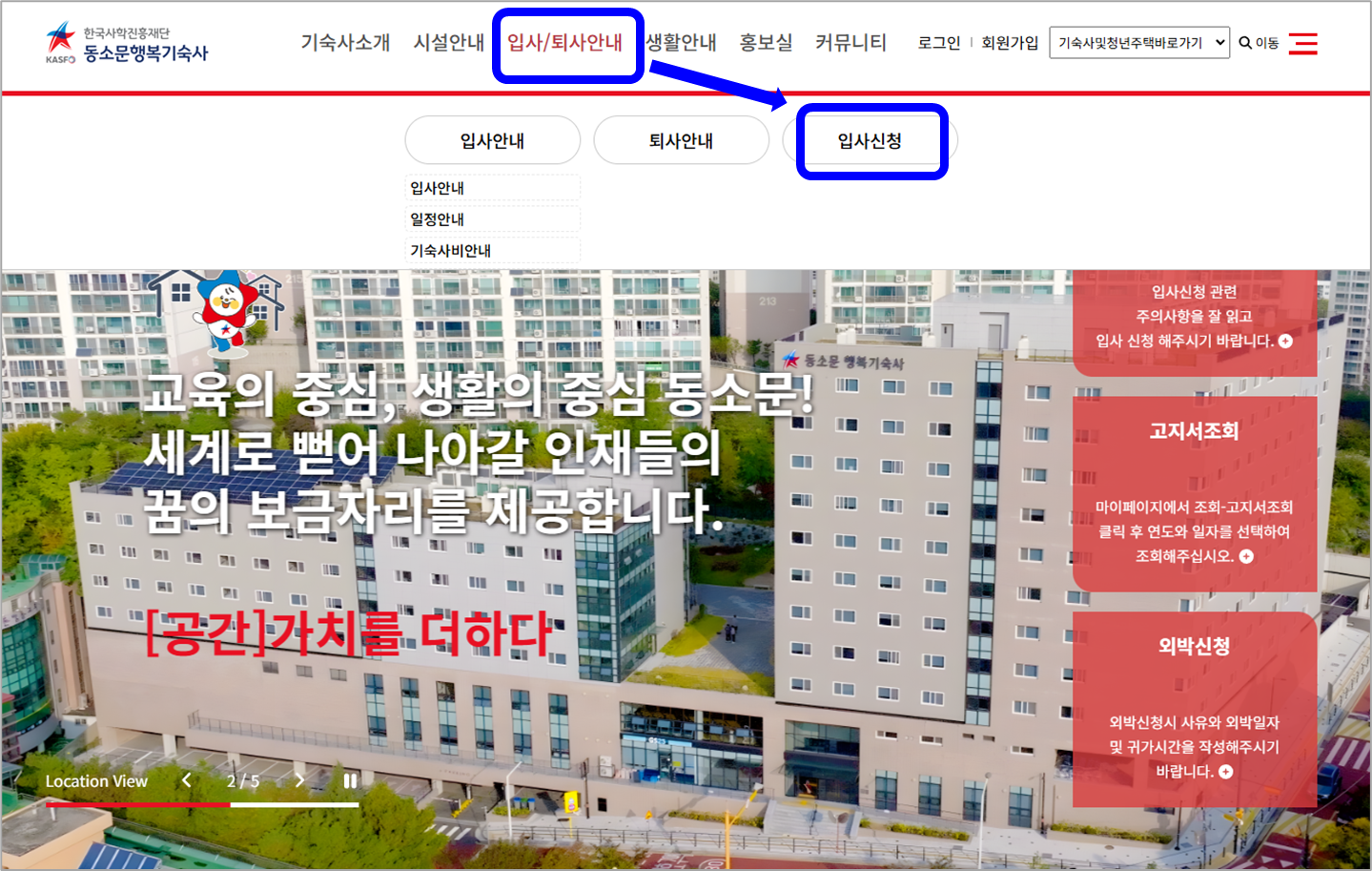기숙사 홈페이지 → 입사/퇴사 안내 → 입사신청