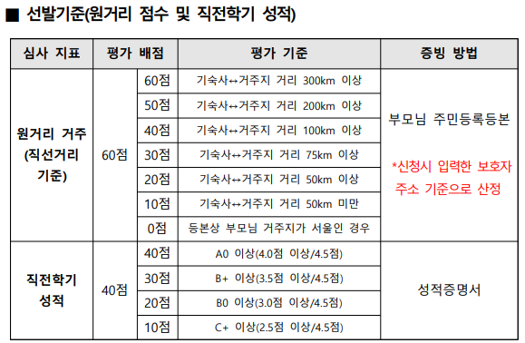 그 다음으로 원거리 거주 및 직전학기 성적을 기준으로 선발합니다.