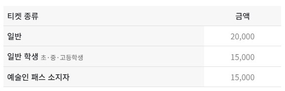 입장료는 일반 성인 기준 20,000원이며, 학생(초, 중, 고등학생)과 예술인 패스 소지자는 15,000원이에요. 현장 구매도 가능하지만, 온라인으로 미리 예매하면 좀 더 편리하게 입장할 수 있어요.