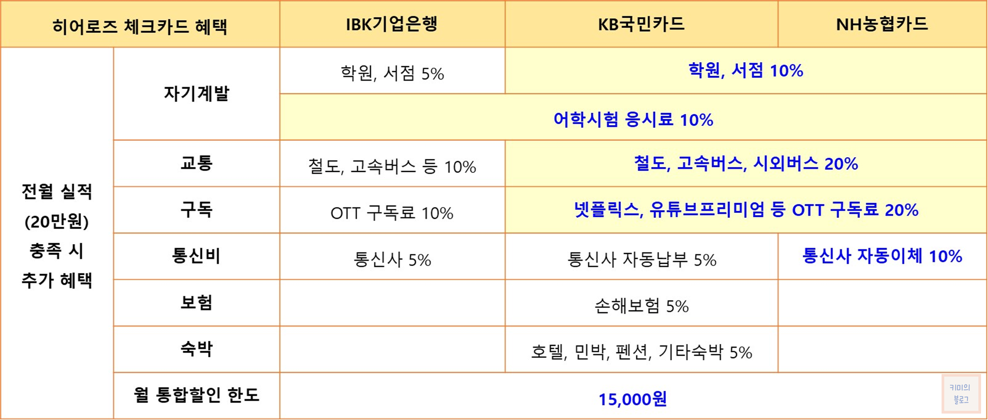 KB국민카드와 NH농협카드의 할인률이 높은 편이며, 통신사 할인을 원하신다면 NH농협 히어로즈 체크카드 발급을 추천드립니다. 그 외 보험이나 숙박비 할인을 원하신다면 KB국민 히어로즈 체크카드를 신청하시는 것이 좋겠습니다.