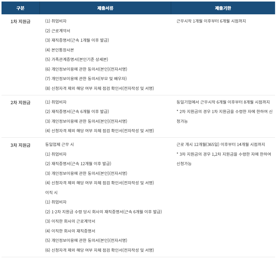 해외취업 정착지원금 신청 시에는 1차, 2차, 3차 지원금 신청에 따라 제출서류가 달라집니다.
