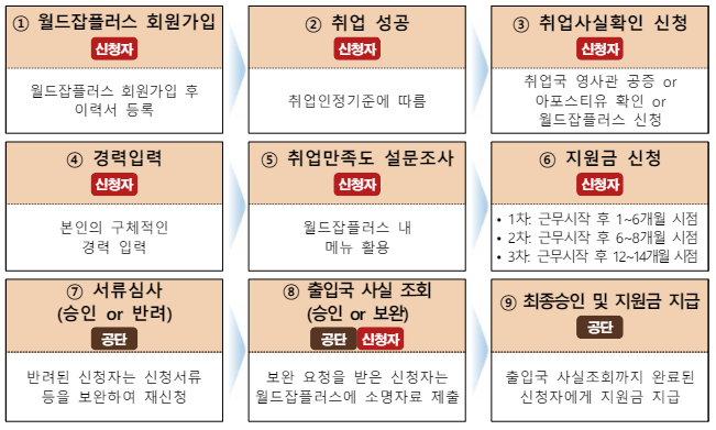 즉, 산업인력공단에서 운영하는 월드잡플러스 사이트(https://www.worldjob.or.kr/new_index.do)에 회원가입하여 구직등록을 한 후에 해외취업에 성공해야 지원금을 받을 수 있습니다.