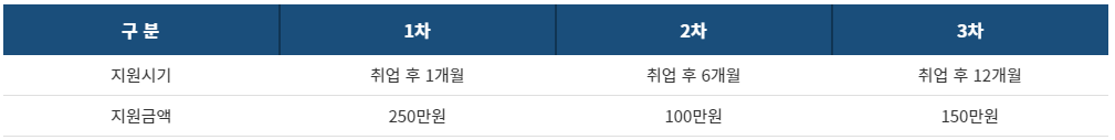 지원금액은 1인당 500만원이고, 1차 250만원, 2차 100만원, 3차 150만원으로 나누어 지급됩니다. 취업 국가와 상관없이 지원금액은 동일합니다.