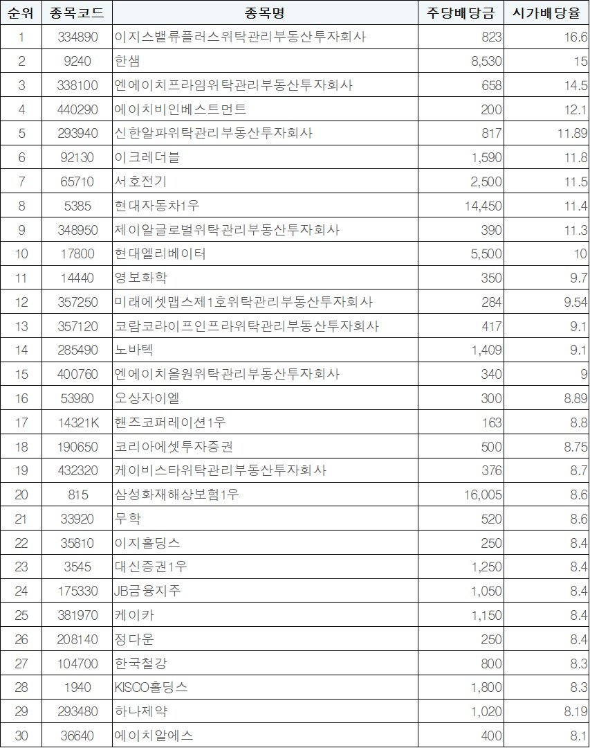 2024년 국내 주식 시가배당률 순위 TOP 30