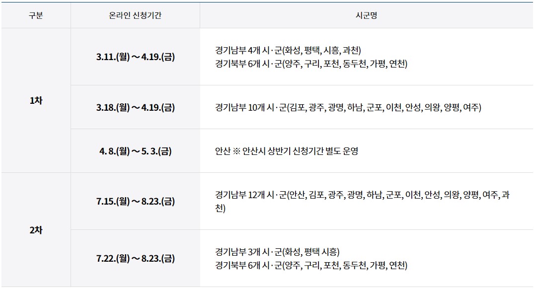 이 사업에 참여하는 시·군은 화성, 안산, 평택, 시흥, 김포, 광주, 광명, 하남, 군포, 이천, 안성, 의왕, 양평, 여주, 과천, 양주, 구리, 포천, 동두천, 가평, 연천 총 21곳입니다.