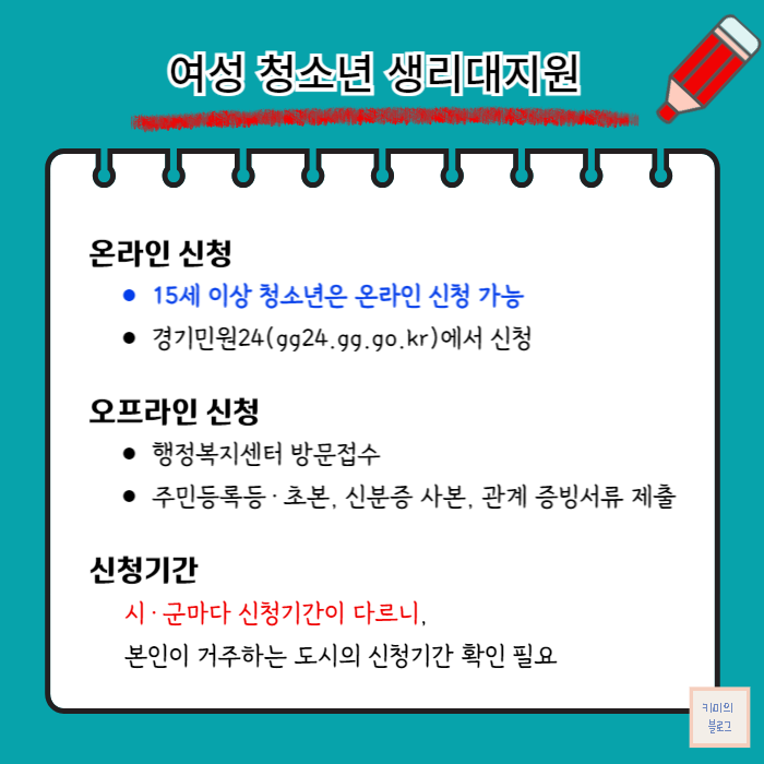 경기도 여성 청소년 생리대지원 신청방법은 온라인 신청과 오프라인 신청 두 가지가 있습니다.