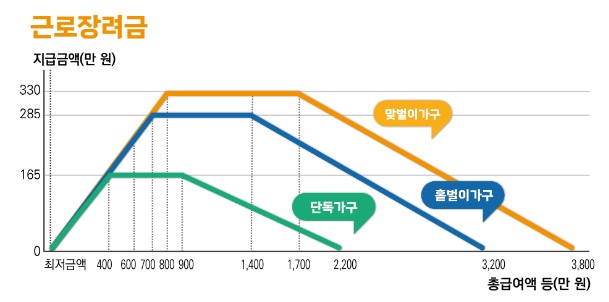 근로장려금 최대지급액은 가구원 구성 유형별로 최대 10% 상향되었습니다.