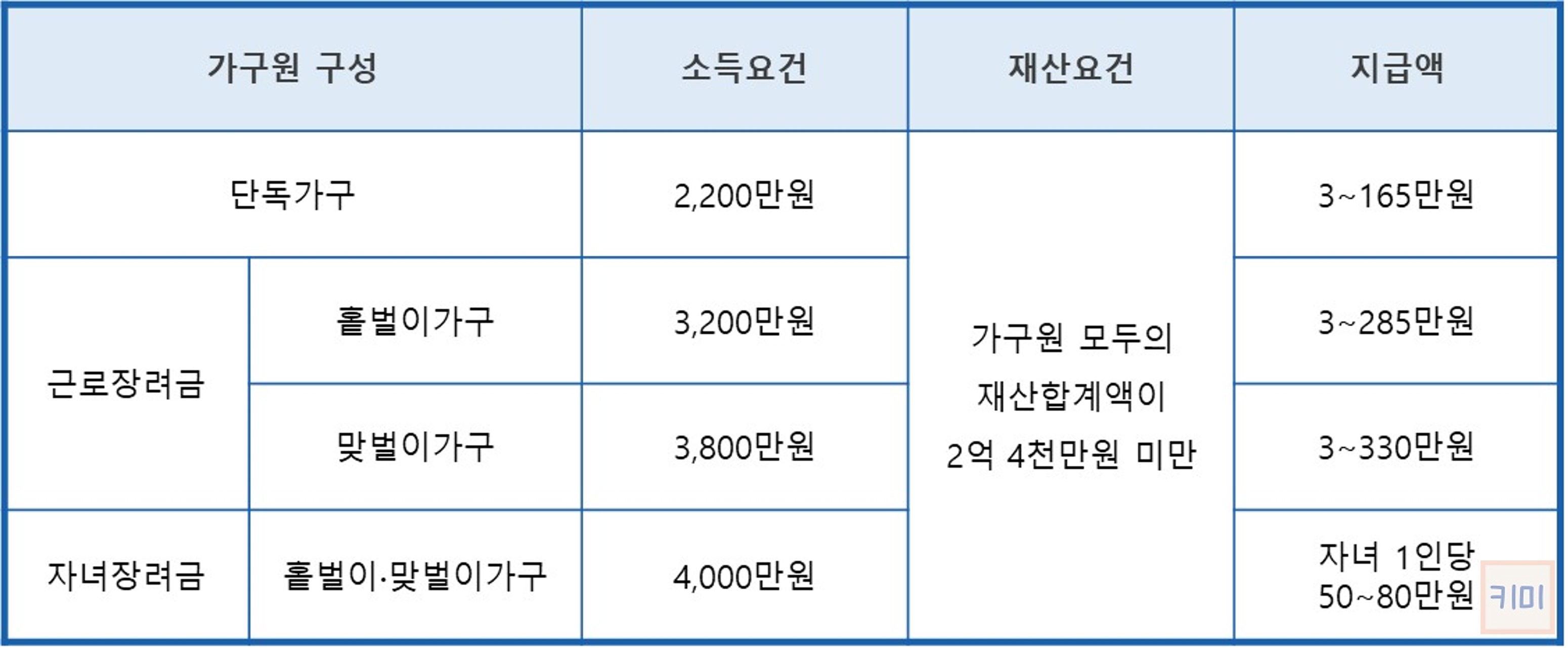 근로장려금 및 자녀장려금은 가구원 구성별 소득요건과 재산요건을 모두 충족해야 신청할 수 있습니다.