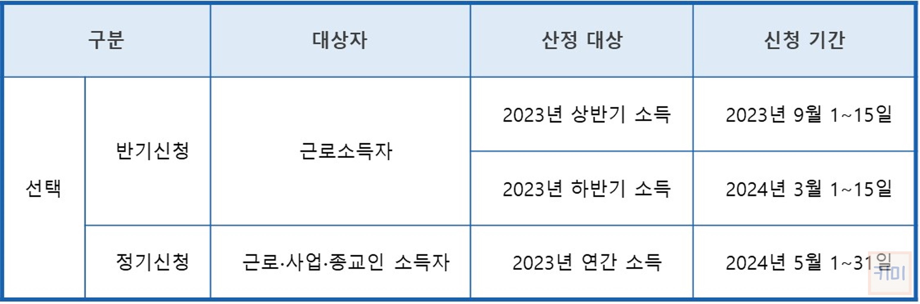 2023년에 본인과 배우자의 소득이 근로소득으로만 구성된 경우, 반기신청을 할 수 있습니다. 근로소득 외 소득이 있는 경우 정기신청 기간에 신청하셔야 합니다.