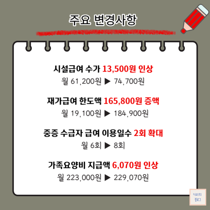 그 외에도 2024년부터 장기요양보험 지원 기준이 완화되어 다양한 혜택이 확대되었습니다.