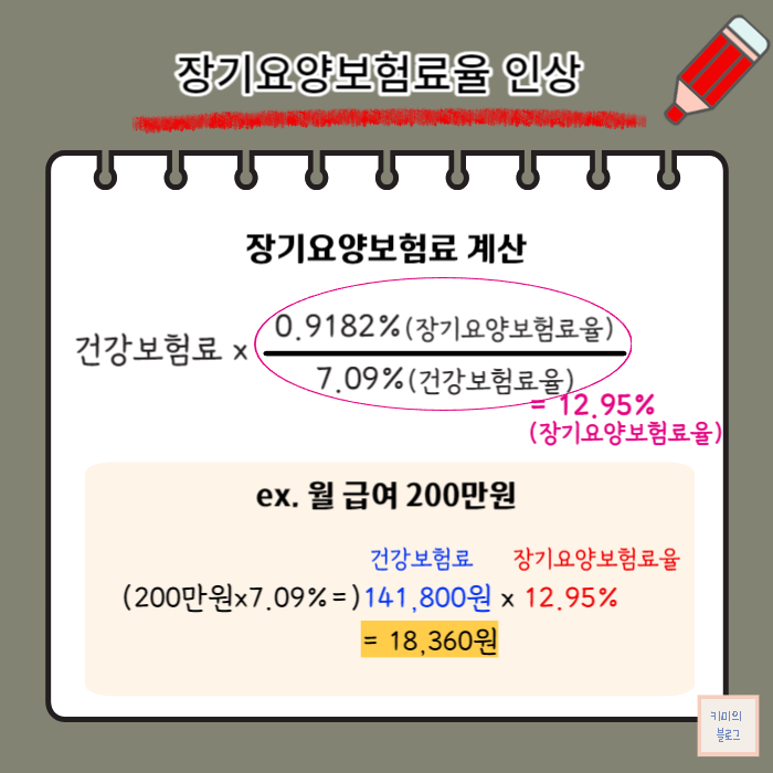 장기요양보험료는 건강보험료에 장기요양보험료율을 곱하여 계산할 수 있습니다. 장기요양보험료율은 0.9182%를 건강보험료율인 7.09%로 나누어 계산하기 때문에, 실질적으로 작년에 비해 0.14% 인상된 것으로 산정됩니다.