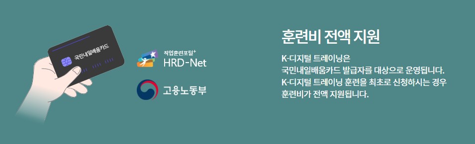 직업훈련포털 메인 화면에서 K-디지털 트레이닝을 선택하고, 원하는 훈련과정을 수강신청하면 됩니다.