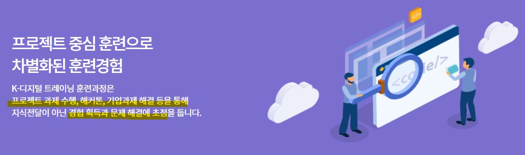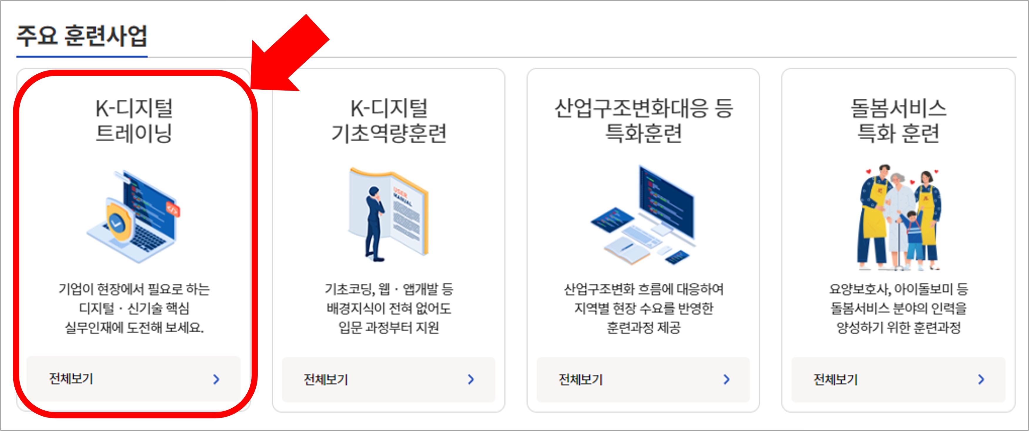 직업훈련포털 메인 화면에서 K-디지털 트레이닝을 선택하고, 원하는 훈련과정을 수강신청하면 됩니다.