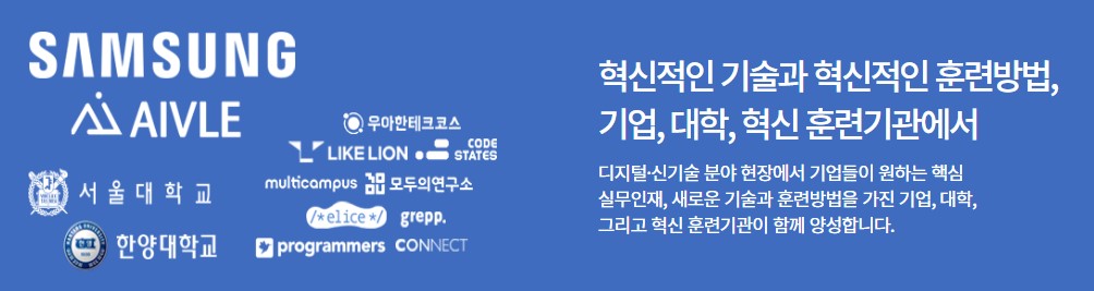 민간 혁신훈련기관과 선도기업(KT, 삼성 등), 우수 대학(서울대, 한양대 등) 등이 참여하여 실전에서 활용할 수 있는 다양한 훈련과정을 제공합니다.