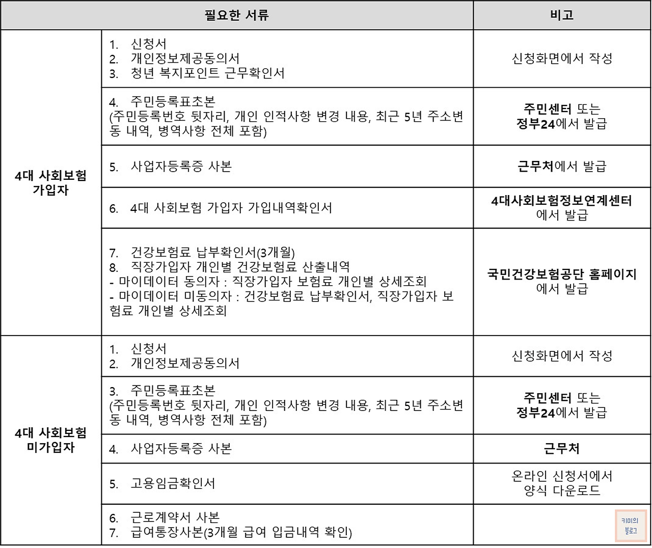 청년복지포인트 신청을 위해서는 아래와 같은 서류가 필요합니다. 4대 보험 가입 여부에 따라 필요 서류가 다르니 확인하여 준비하시기 바랍니다.