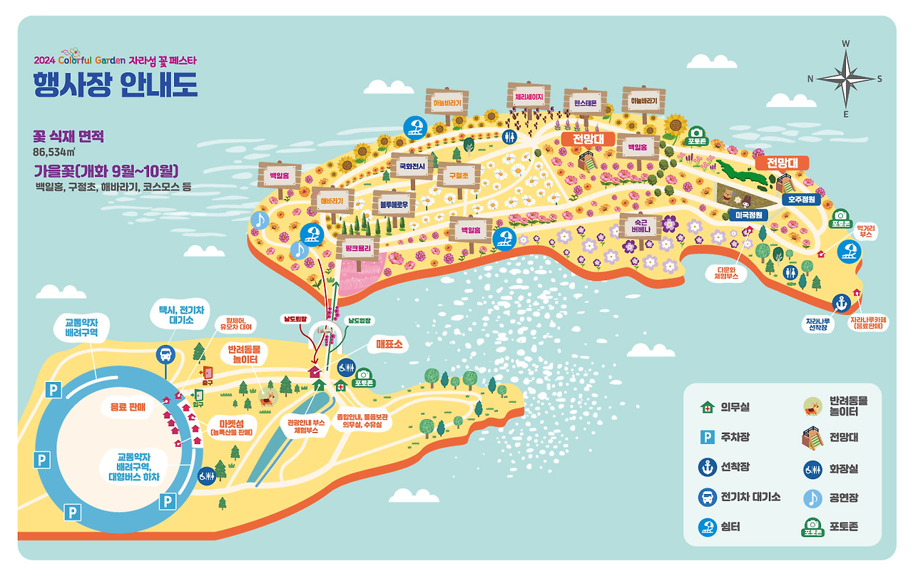 매년 9~10월 가을에는 자라섬 남도에서 꽃 축제가 열립니다. 가을 테마별 꽃 정원이 조성되어 있고 여러 가지 공연, 전시, 체험 프로그램과 지역 농특산물 판매부스, 반려동물 놀이터도 있어서 가족과 즐기기에 좋습니다.