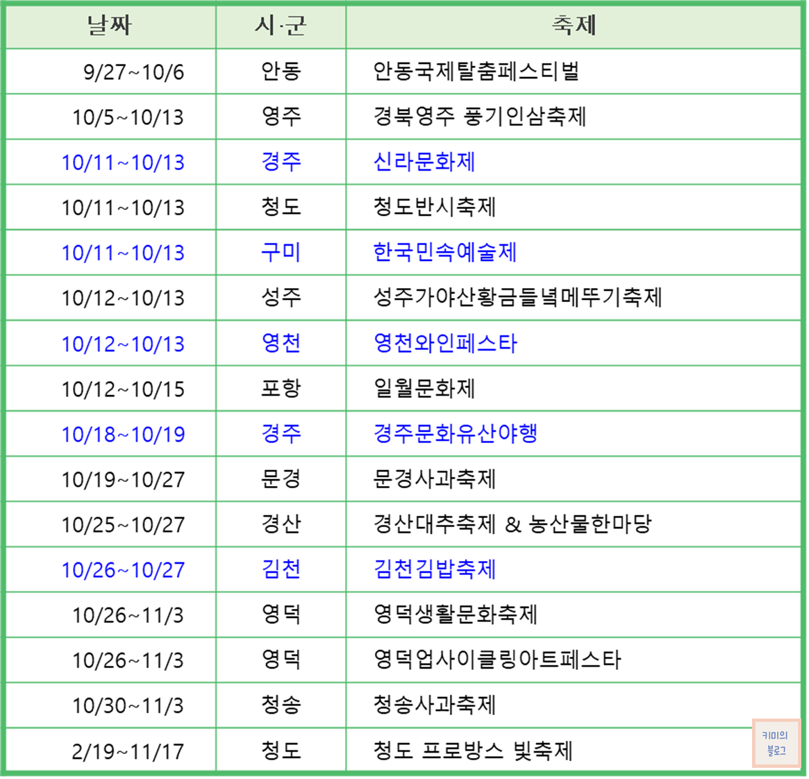 이를 포함하여 2024년 10월 경북 지역에서 열리는 축제 일정은 아래 표에서 확인하실 수 있습니다.