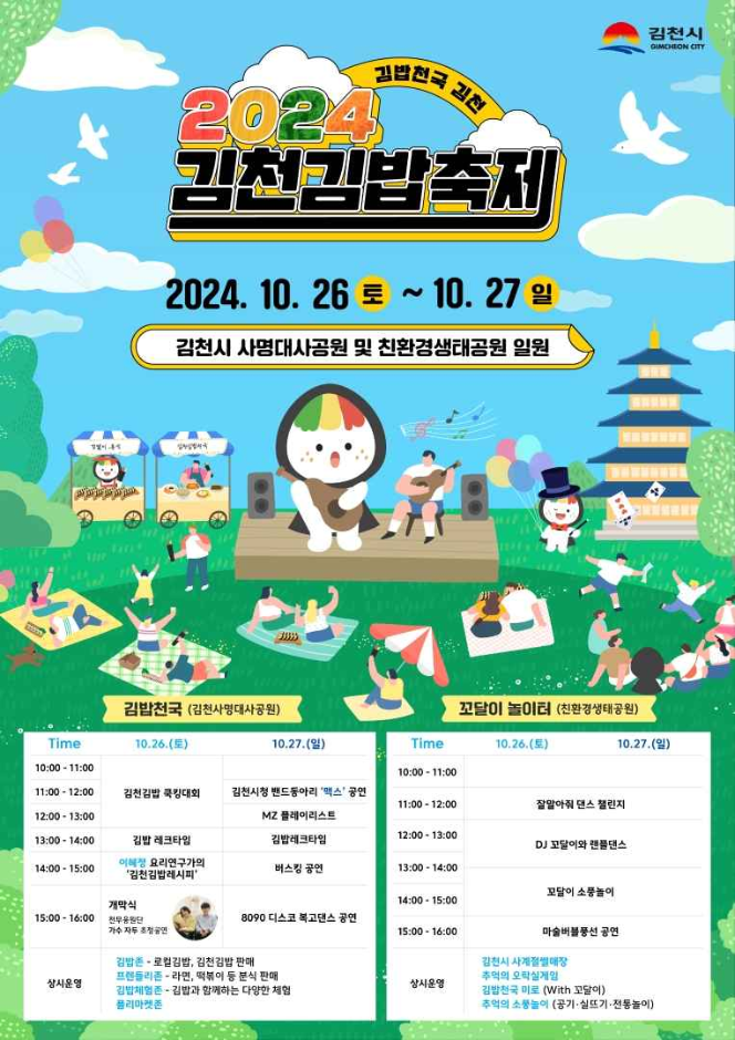 김천 김밥축제는 김천시의 이름이 김밥천국의 줄임말과 같다는 점에서 착안한 축제입니다. 김밥은 소풍이나 체육대회 같이 특별한 날 먹던 음식이라는 점을 부각하여 김밥 요리대회와 김밥 레시피 소개를 비롯해서 김밥 체험, 추억의 오락실게임, 소풍놀이, 미로존, 썰매장과 같이 즐거운 프로그램들이 준비되어 있습니다.