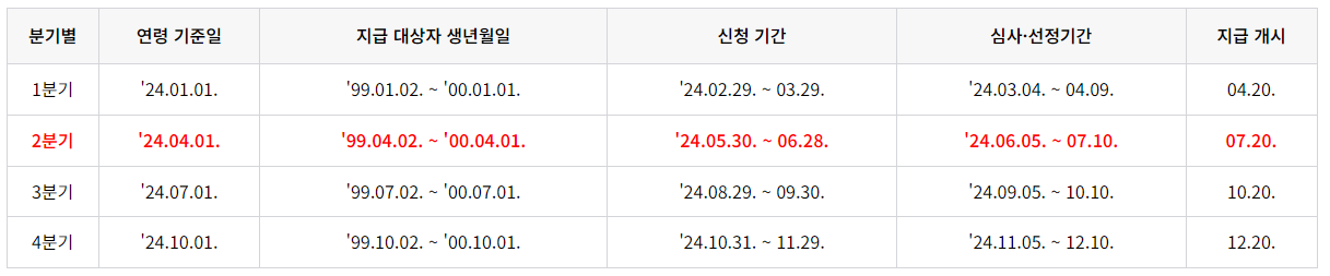 지난 1분기 신청을 놓치신 경우, 2024년 4월 1일 기준 24세 청년에 한해서 1분기 미신청분을 추가신청할 수 있습니다.